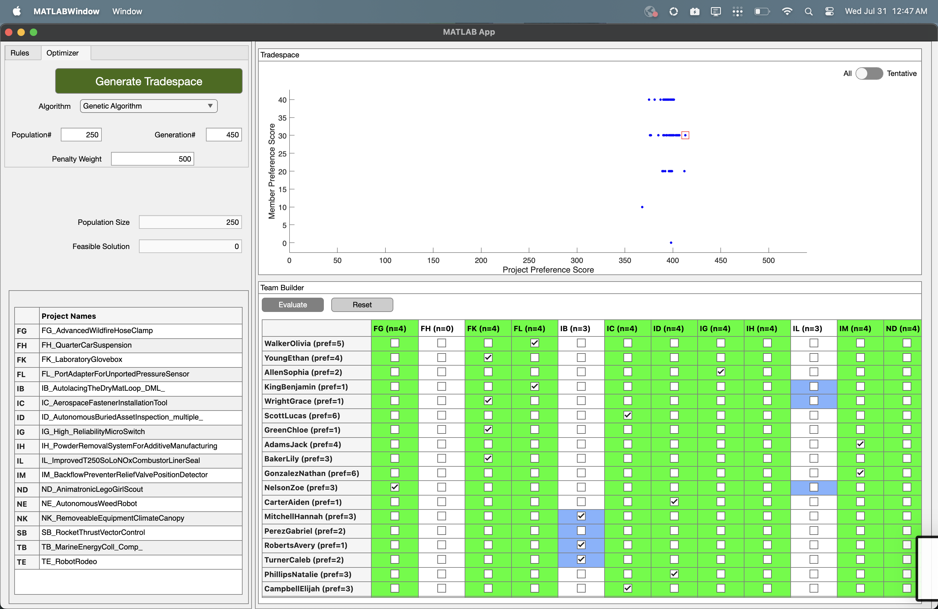This research primarily revolved around the creation and improvement of a MATLAB application that leveraged tradespace exploration for the formation of teams for a Mechanical Engineering Senior Project course. In laymen’s terms we used the creation of several generations of solutions, or team combinations assigned to different projects, and imitated the process of natural selection to propagate more successful solutions through the generations to ultimately result in better and better solutions. A better solution was defined by the level of satisfaction that all members of a team have with the members that they are partnered with as well as the project they are assigned to. After performing this calculation for a number of generations, we then displayed all the solutions in the final generation for a human user to interact with and ultimately select which solution they found the most appealing performance wise.